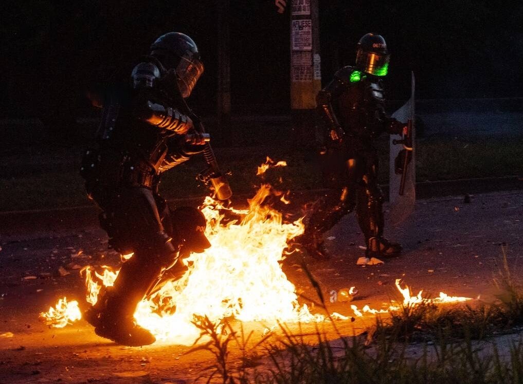Una avenida bloqueada. Contenedores con fuego en su interior mientras se queman ramas y bolsas de basura que generan humo espeso, humo que contrarresta el gas lacrimógeno y le dificulta al enemigo ver los movimientos del pueblo rebelde. El piso húmedo por los chorros de agua podrida que escupen con sevicia las tanquetas policiales. Encapuchados, de lado y lado, oficiales e insurrectos, que intercambian miradas de odio. Un olor a gas, denso y pesado como un yugo del que cientos de proletarios y oprimidos en las calles luchan por quitarse de encima. Rocas van, perdigones vienen. Una bomba molotov hace dispersar la fila de la escuadra policial. Arremete la reacción. “¡No den la espalda!”, grita una voz ronca que se encuentra en ese doloroso tránsito hacia la adultez. Algunos salen a corren. Otros, resisten la brutal embestida con sus escudos improvisados y contraatacan al grito de “uno, dos, tres” llueven piedras y una que otra incendiaria que hace detener a los perros rabiosos del Estado. Y así, pasan los minutos y horas en alguna calle de Colombia en la que los jóvenes provenientes de familias obreras, principalmente, se les plantan combativamente a las fuerzas asesinas del ESMAD.