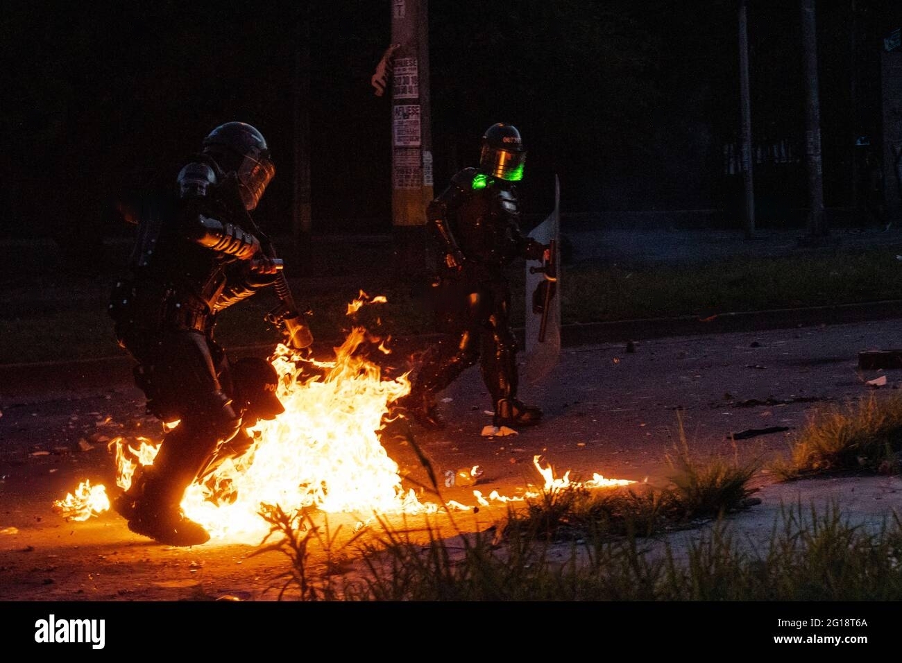 Una avenida bloqueada. Contenedores con fuego en su interior mientras se queman ramas y bolsas de basura que generan humo espeso, humo que contrarresta el gas lacrimógeno y le dificulta al enemigo ver los movimientos del pueblo rebelde. El piso húmedo por los chorros de agua podrida que escupen con sevicia las tanquetas policiales. Encapuchados, de lado y lado, oficiales e insurrectos, que intercambian miradas de odio. Un olor a gas, denso y pesado como un yugo del que cientos de proletarios y oprimidos en las calles luchan por quitarse de encima. Rocas van, perdigones vienen. Una bomba molotov hace dispersar la fila de la escuadra policial. Arremete la reacción. “¡No den la espalda!”, grita una voz ronca que se encuentra en ese doloroso tránsito hacia la adultez. Algunos salen a corren. Otros, resisten la brutal embestida con sus escudos improvisados y contraatacan al grito de “uno, dos, tres” llueven piedras y una que otra incendiaria que hace detener a los perros rabiosos del Estado. Y así, pasan los minutos y horas en alguna calle de Colombia en la que los jóvenes provenientes de familias obreras, principalmente, se les plantan combativamente a las fuerzas asesinas del ESMAD.