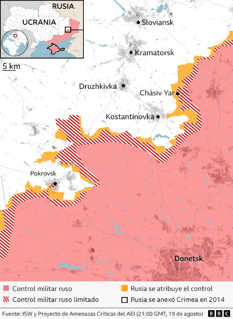 La gráfica nos muestra el estado actual de la disputa territorial donde el gobierno de Putin tiene el claro propósito de anexionarse todo el territorio del Donbás, un propósito que se consolidó desde 2014 cuando se anexionó la estratégica península de Crimea que fue en plata blanca, como el zarpazo inicial para medirle el aceite a sus adversarios occidentales, quienes no reaccionaron con contundencia; y así las cosas, les dieron carta blanca a los rusos para ir por más. Intención que se cristalizó usando como disculpa el propósito de vincular a Ucrania a la OTAN, los rusos lanzaron su poderío militar y hoy tienen bajo su control el 100% de Crimea, el 99% de Lugansk, el 70% de Donestk, el 74% de Zaporiyia y el 76% de Jersón; todo lo cual suma el 20% del territorio ucraniano… Y quieren más.