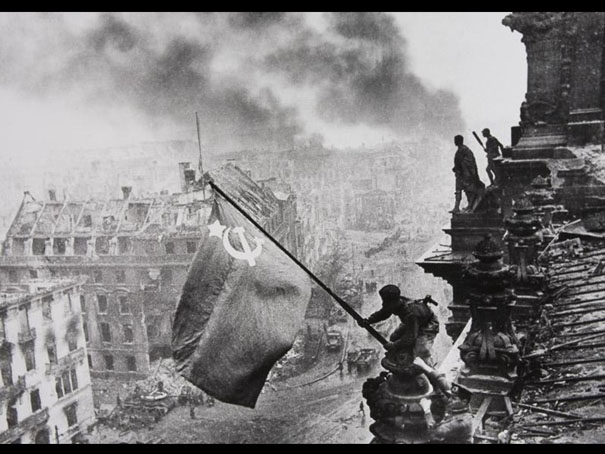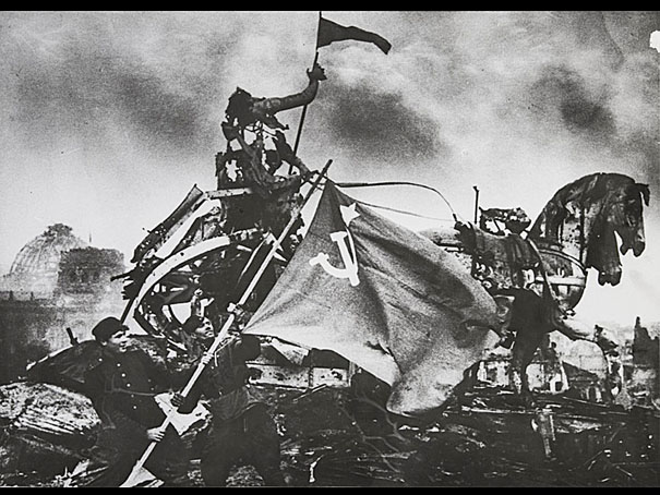 El Ejército Rojo llegó a Berlín, último bastión del ejército nazi, a finales de abril de 1945. Yevgeny Khaldei, soldado y reportero gráfico soviético, estaba decidido a fotografiar la toma de la ciudad y la victoria sobre Hitler. Se dice que cuando se dio cuenta de que no había banderas soviéticas en la ciudad alemana, subió a un avión rumbo a Moscú; allí buscó durante todo el día una bandera. Al entrar en una tienda decidió tomar algunos manteles rojos utilizados para eventos formales; los pidió prestados a un trabajador y los llevó a su tío: un sastre que se quedó toda la noche despierto para coser la hoz, el martillo y la estrella amarilla.